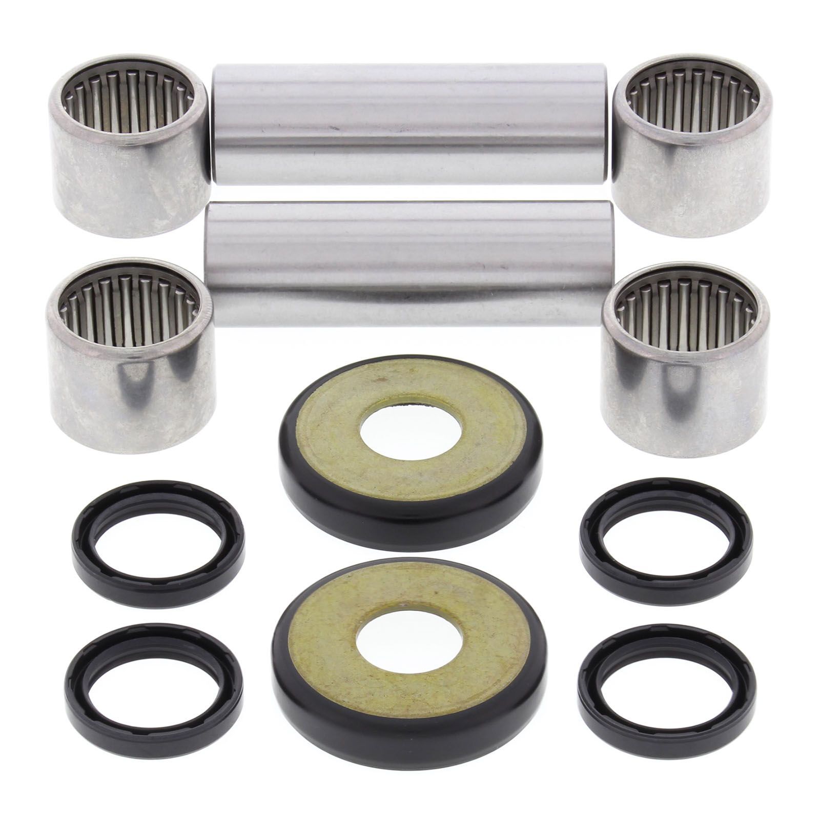A Quality Swing Arm Repair Kit from All Balls Racing. Bushings are case hardened and plated to prevent wear and corrosion. POM composite washer bearings replace thrust needle washers for susperior resistance to water and dirt and increase service life. Shafts are made from 52100 Bearing steel, through hardened and precision ground. Needle Bearings are made from 52100 bearing steel and ARC61-65 heat treated ST13 steel shell.