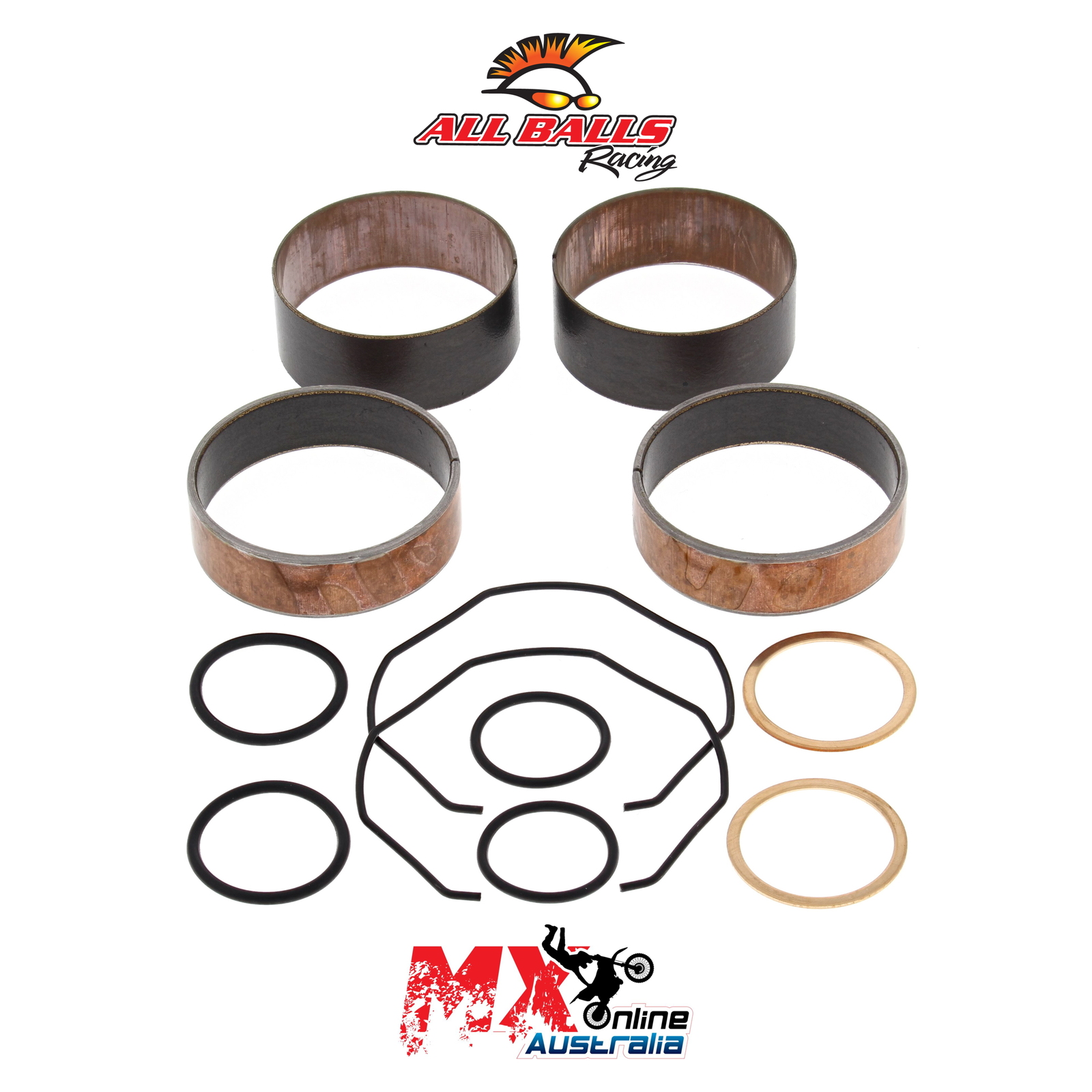 A Quality Fork Bushing Kit from All Balls Racing. Bushings Dyno tested to 500,000 strokes with less wear than OEM bushings. Includes 2 slider bushings and 2 leg bushings along with all copper washers, o-rings and fork seal snap rings.