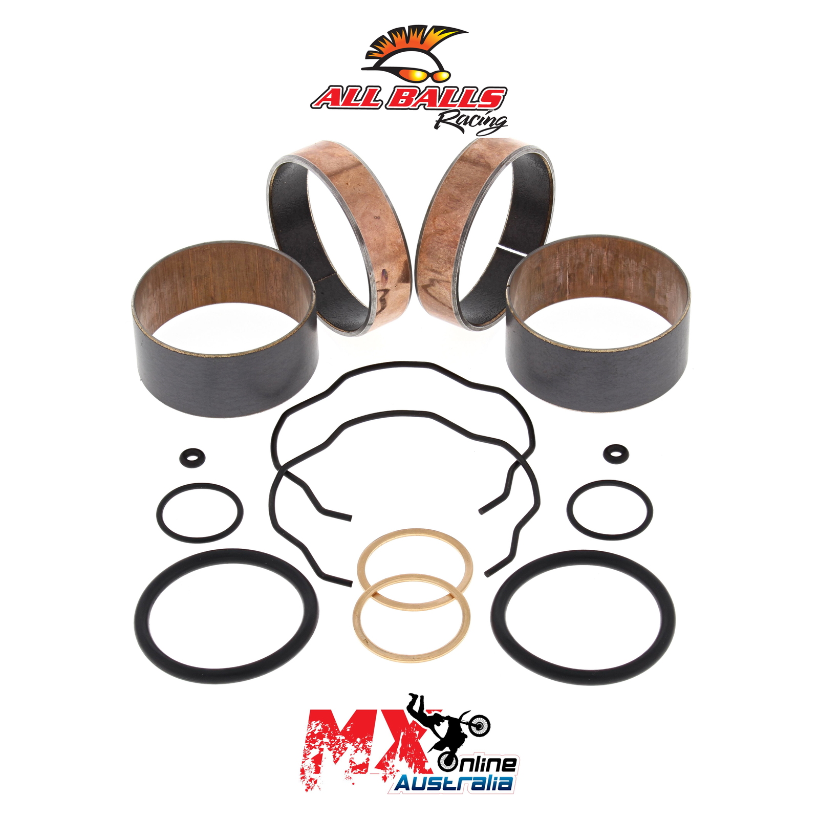 A Quality Fork Bushing Kit from All Balls Racing. Bushings Dyno tested to 500,000 strokes with less wear than OEM bushings. Includes 2 slider bushings and 2 leg bushings along with all copper washers, o-rings and fork seal snap rings.