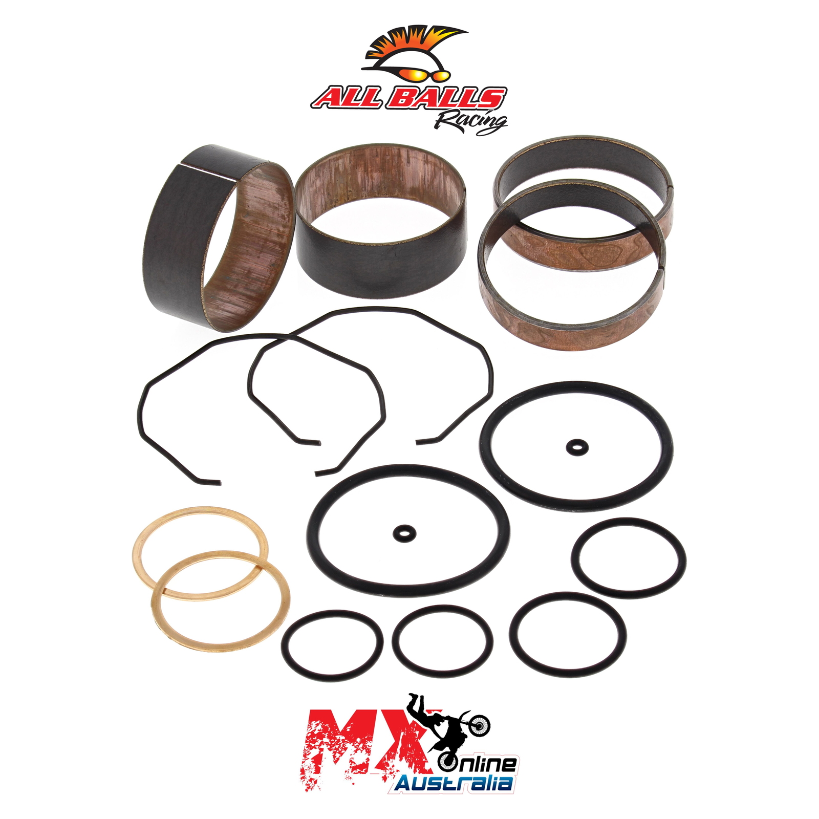 A Quality Fork Bushing Kit from All Balls Racing. Bushings Dyno tested to 500,000 strokes with less wear than OEM bushings. Includes 2 slider bushings and 2 leg bushings along with all copper washers, o-rings and fork seal snap rings.