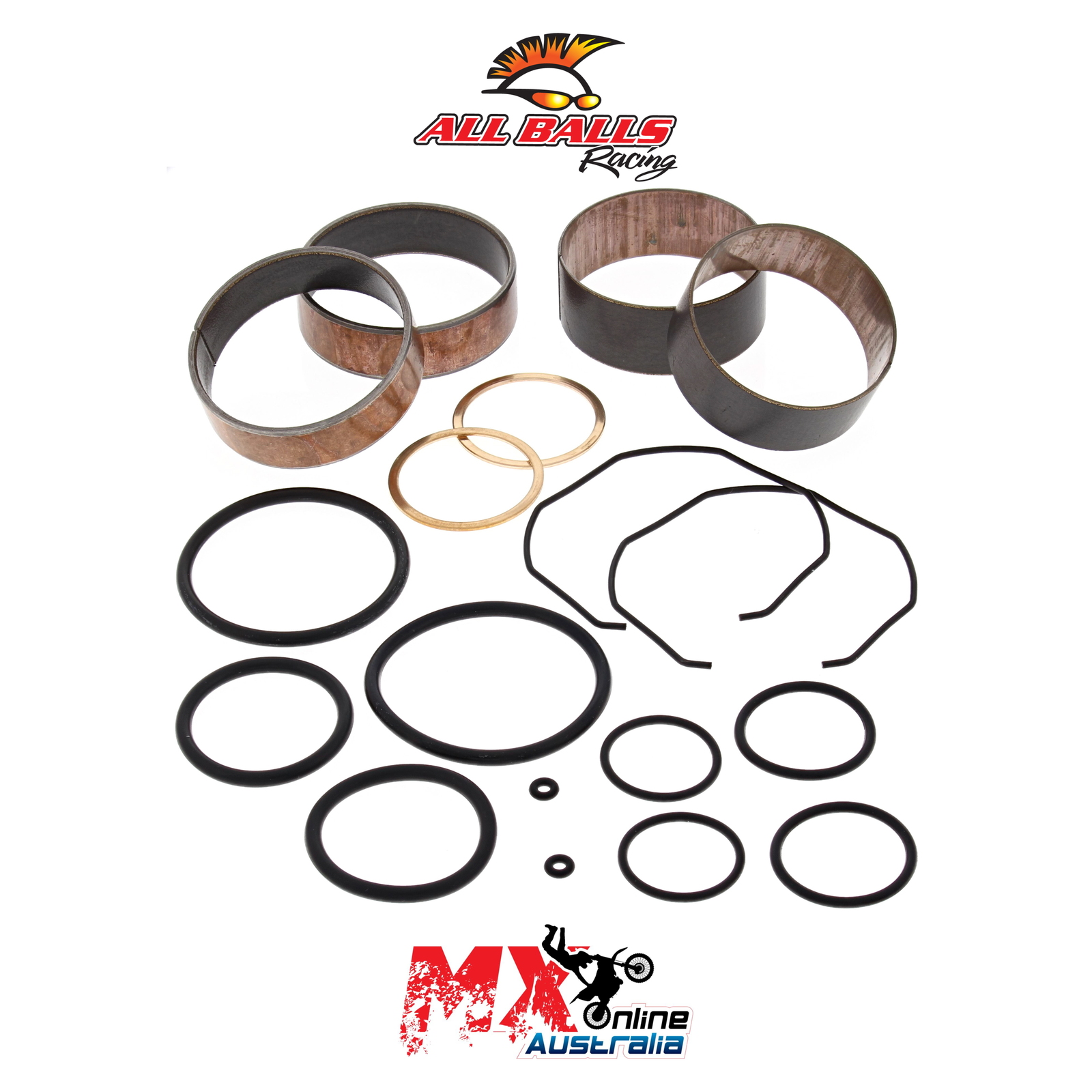 A Quality Fork Bushing Kit from All Balls Racing. Bushings Dyno tested to 500,000 strokes with less wear than OEM bushings. Includes 2 slider bushings and 2 leg bushings along with all copper washers, o-rings and fork seal snap rings.