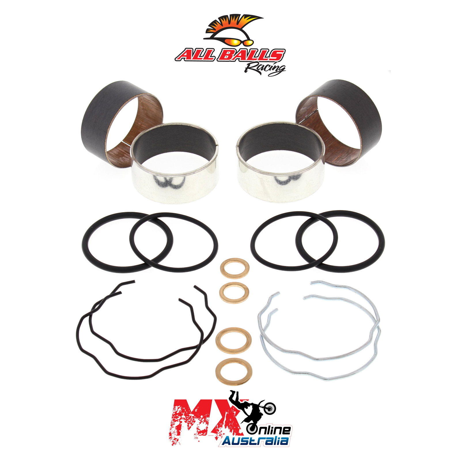 A Quality Fork Bushing Kit from All Balls Racing. Bushings Dyno tested to 500,000 strokes with less wear than OEM bushings. Includes 2 slider bushings and 2 leg bushings along with all copper washers, o-rings and fork seal snap rings.