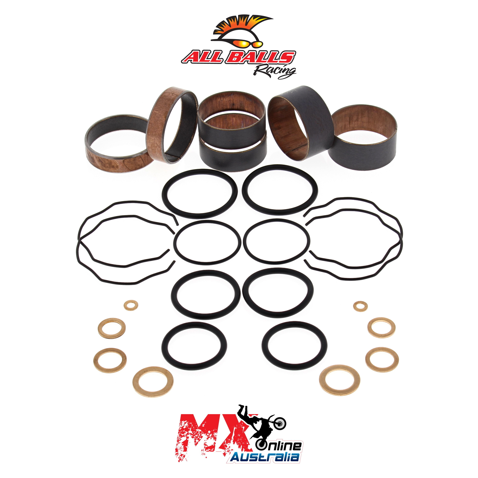 A Quality Fork Bushing Kit from All Balls Racing. Bushings Dyno tested to 500,000 strokes with less wear than OEM bushings. Includes 2 slider bushings and 2 leg bushings along with all copper washers, o-rings and fork seal snap rings.