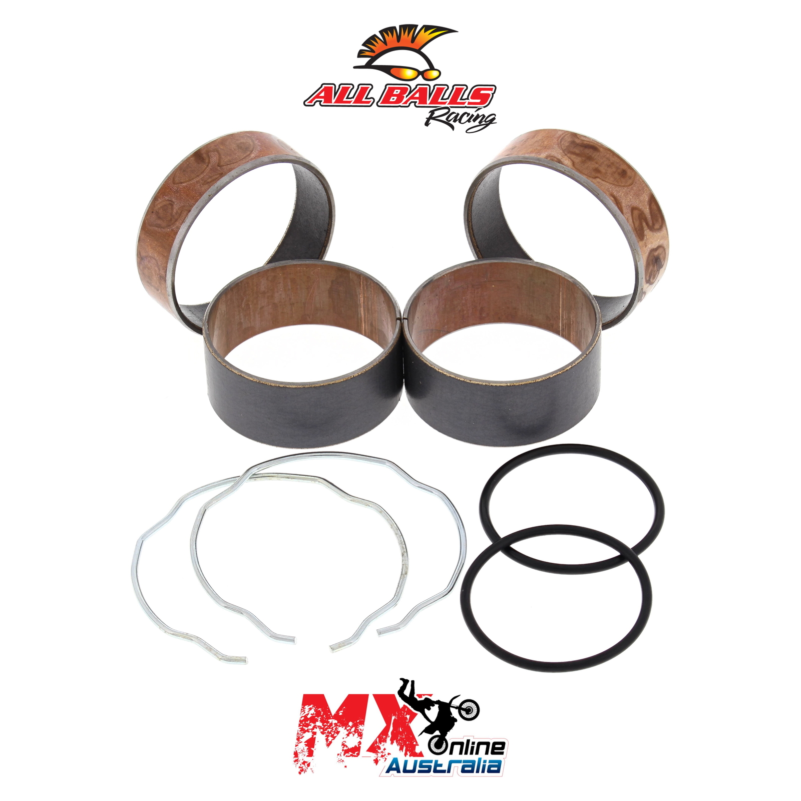 A Quality Fork Bushing Kit from All Balls Racing. Bushings Dyno tested to 500,000 strokes with less wear than OEM bushings. Includes 2 slider bushings and 2 leg bushings along with all copper washers, o-rings and fork seal snap rings.