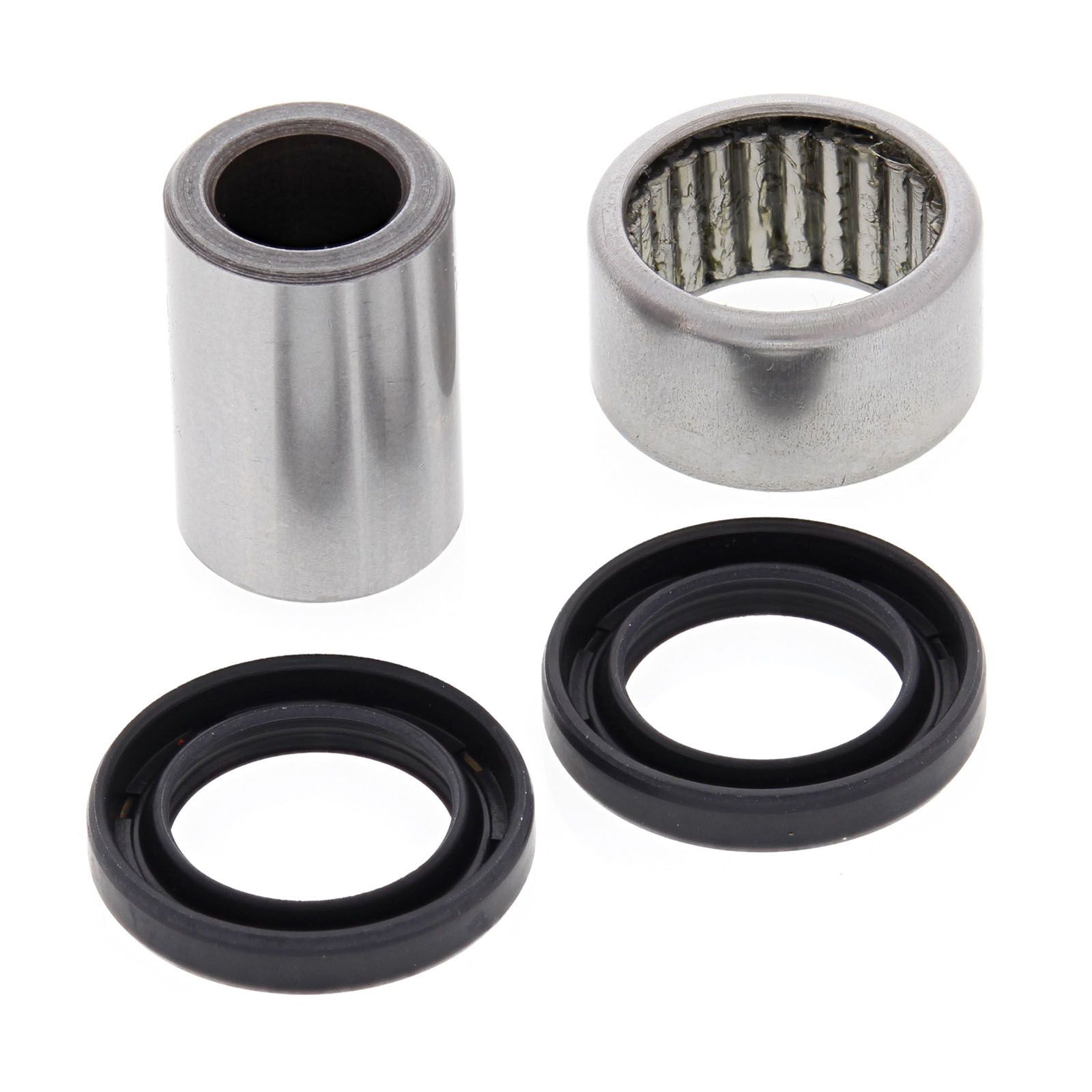 A Quality Rear Shock Bearing Kit from All Balls Racing. Kits are supplied with either Needle Bearings or Spherical Bearings according to OE vehicle configuration. Also included are cup type seals-OEM style and hardened and precision ground bushes.