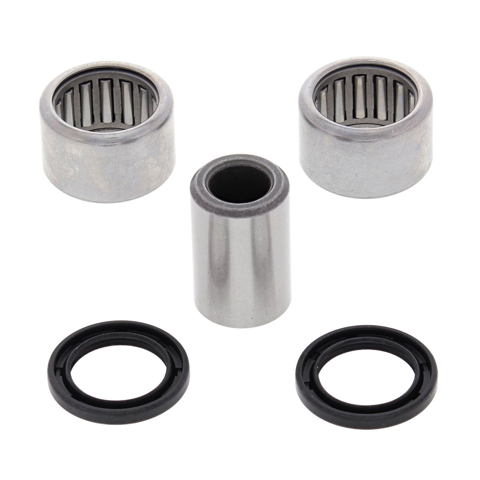 A Quality Rear Shock Bearing Kit from All Balls Racing. Kits are supplied with either Needle Bearings or Spherical Bearings according to OE vehicle configuration. Also included are cup type seals-OEM style and hardened and precision ground bushes.