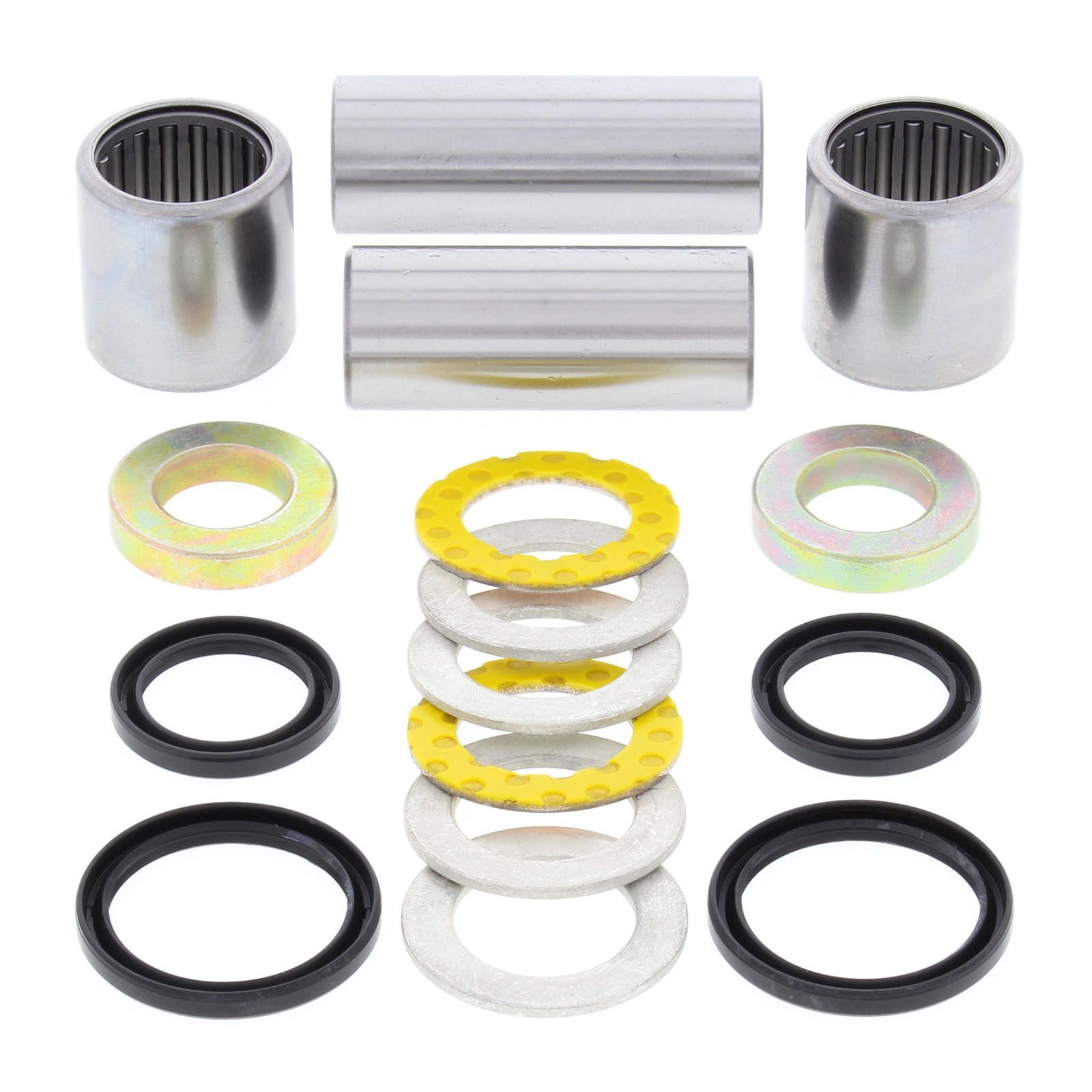 A Quality Swing Arm Repair Kit from All Balls Racing. Bushings are case hardened and plated to prevent wear and corrosion. POM composite washer bearings replace thrust needle washers for susperior resistance to water and dirt and increase service life. Shafts are made from 52100 Bearing steel, through hardened and precision ground. Needle Bearings are made from 52100 bearing steel and ARC61-65 heat treated ST13 steel shell.
