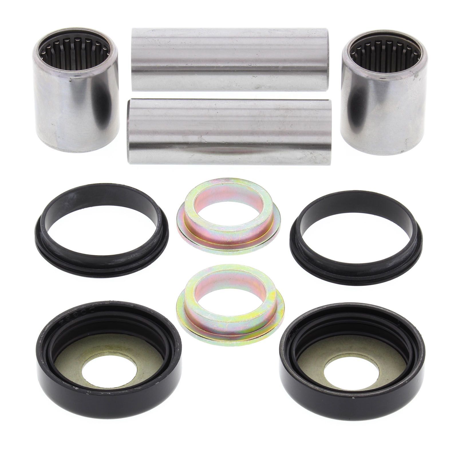 A Quality Swing Arm Repair Kit from All Balls Racing. Bushings are case hardened and plated to prevent wear and corrosion. POM composite washer bearings replace thrust needle washers for susperior resistance to water and dirt and increase service life. Shafts are made from 52100 Bearing steel, through hardened and precision ground. Needle Bearings are made from 52100 bearing steel and ARC61-65 heat treated ST13 steel shell.