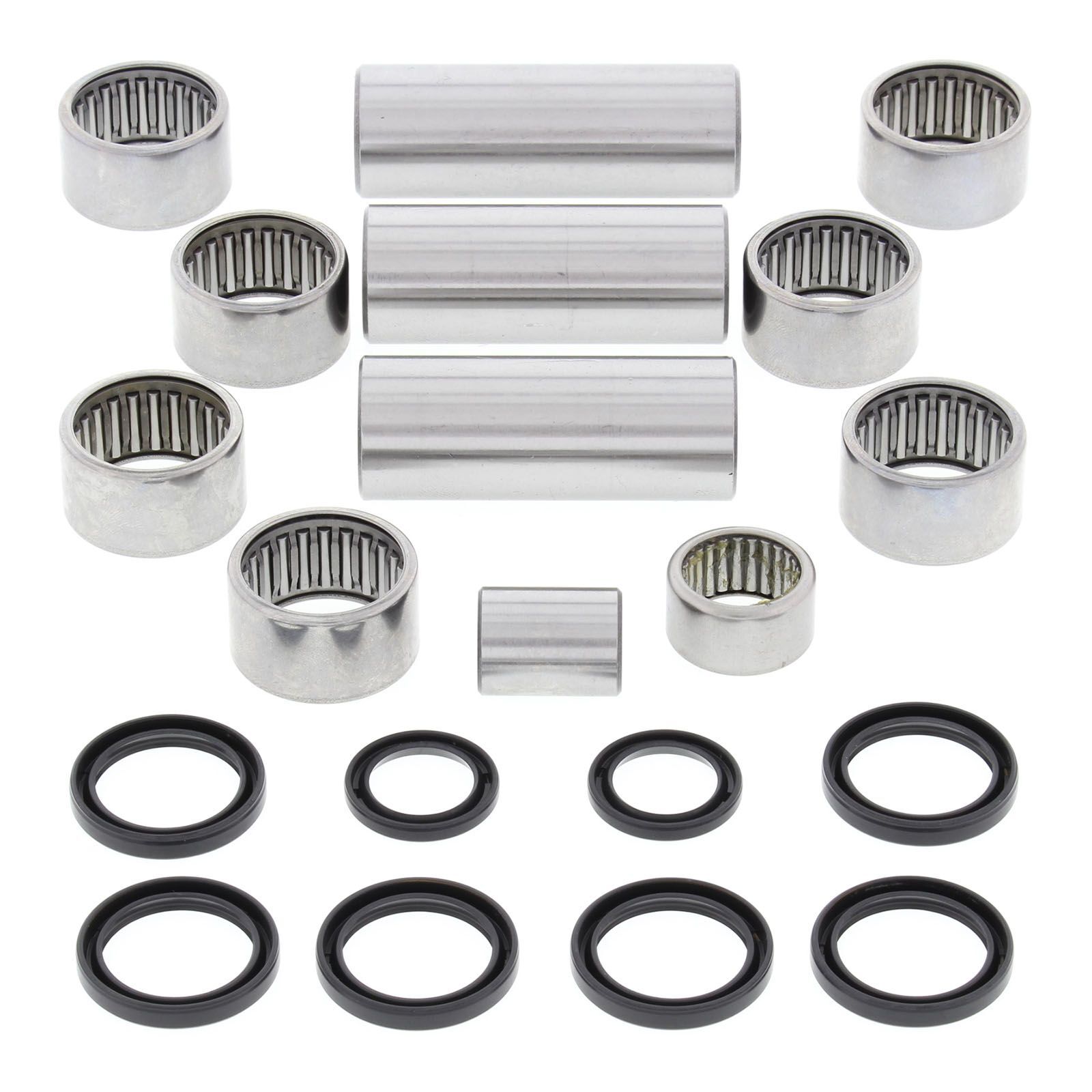 A Quality Suspension Linkage Kit from All Balls Racing. Kit includes lower shock bearing kit! Needle Bearings are made from 52100 bearing steel, ARC61-65 heat treated ST13 steel shell. Bushings are case hardened and plated to prevent wear and corrosion. Shafts are made from 52100 Bearing steel, through hardened and precision ground.