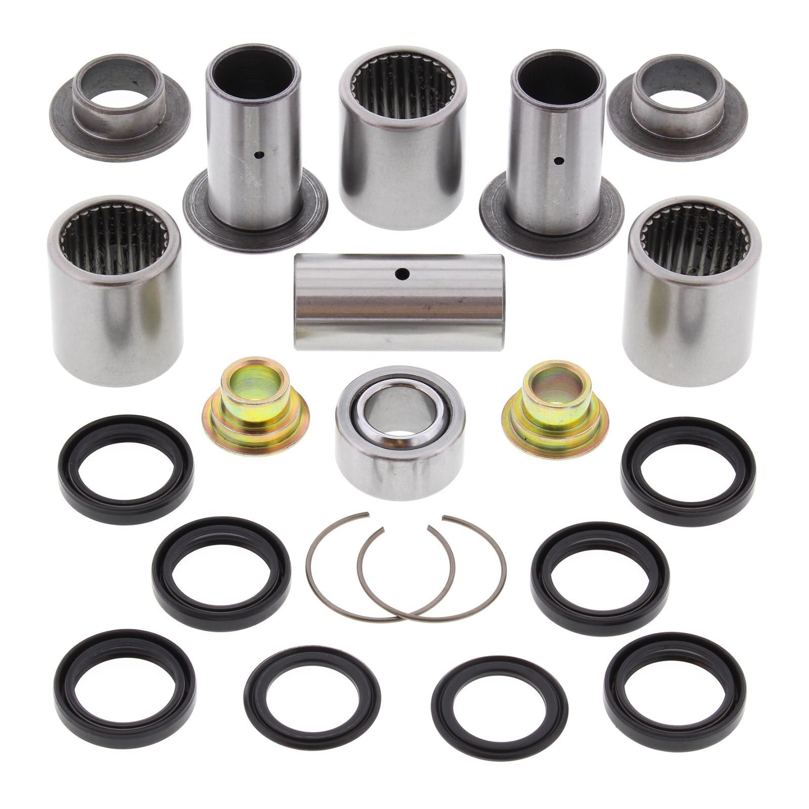 A Quality Suspension Linkage Kit from All Balls Racing. Kit includes lower shock bearing kit! Needle Bearings are made from 52100 bearing steel, ARC61-65 heat treated ST13 steel shell. Bushings are case hardened and plated to prevent wear and corrosion. Shafts are made from 52100 Bearing steel, through hardened and precision ground.