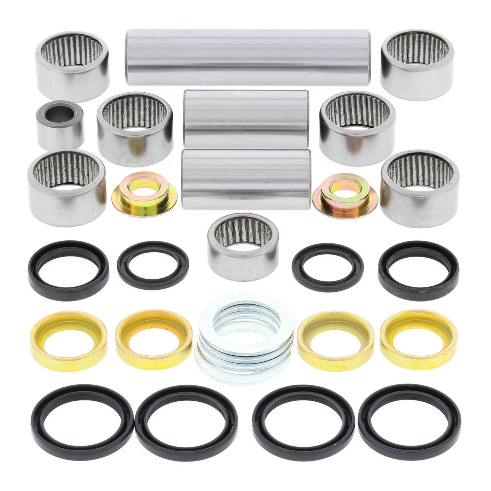 A Quality Suspension Linkage Kit from All Balls Racing. Kit includes lower shock bearing kit! Needle Bearings are made from 52100 bearing steel, ARC61-65 heat treated ST13 steel shell. Bushings are case hardened and plated to prevent wear and corrosion. Shafts are made from 52100 Bearing steel, through hardened and precision ground.