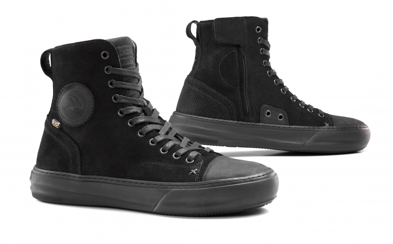 Full-grain embossed leather upper and "Air-Tech" ventilated liner. "D3O" reinforced ankle cups. Laces and zipper combined closure. Raised inner-sole. High-grip rubber sole.
