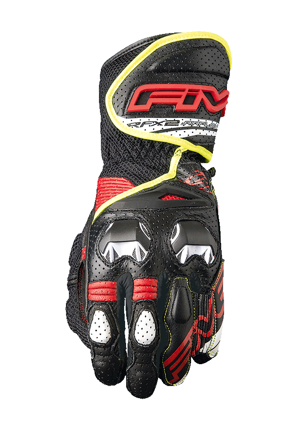 RACING SPIRIT, TOP-CLASS VENTILATION! \nThe RFX2 AIRFLOW has considerably evolved in 2021 and echoes the characteristics of the latest RFX2, making it a standard in ventilated gloves. For sport and road use, it features the ventilated topside TPU shells of the RFX1 and RFX2, but includes specific materials (perforated leather, mesh fabric) that offer optimal airflow. The mixedmaterial palm, in full-grain leather, perforated leather, and synthetic leather reinforcements for optimal grip, features a TPR protective slider shell on the hypothenar. Its PU cuff, a legacy of the exceptional RFX Race glove, offers extra protection on the forearm and gives the RFX2 a truly sleek and stylish look. The thumb and topside are in mesh fabric for maximum airflow. It also features gel reinforcements on the thumbs, for greater comfort at the controls. The RFX2 Airflow offers high-level protection, excellent fit, and, more than anything, effective ventilation that makes it the perfect glove for riding a sport bike in summertime. \n \nTECHNICAL FEATURES \n• Perforated Full-grain goat-leather and mesh fabric construction, for ventilation (topside) / Goat leather on the palm side, for extreme suppleness \n• Ventilated TPU metacarpophalangeal protective shells \n• 5 mm-thick foam rubber metacarpal reinforcements \n• Synthetic leather palm reinforcement with silicone print for improved handlebar grip \n• Honeycombed 3D mesh panels around the thumbs and ends of the index and middle fingers \n• Internal Kevlar® lining on the topside of the hand \n• External stitching on the fingers (in Gütermann thread) \n• Hypothenar protective shell (palm slider) in TPR \n• Forearm protective shell in TPU (identical to the one used for the RFX Race) \n• Dual closure system, with adjustment tab underneath a protective flap \n• Anti-twist accordion band between the ring and little fingers in order to limit the risk of fingers being pulled apart if you fall (a FIVE innovation)