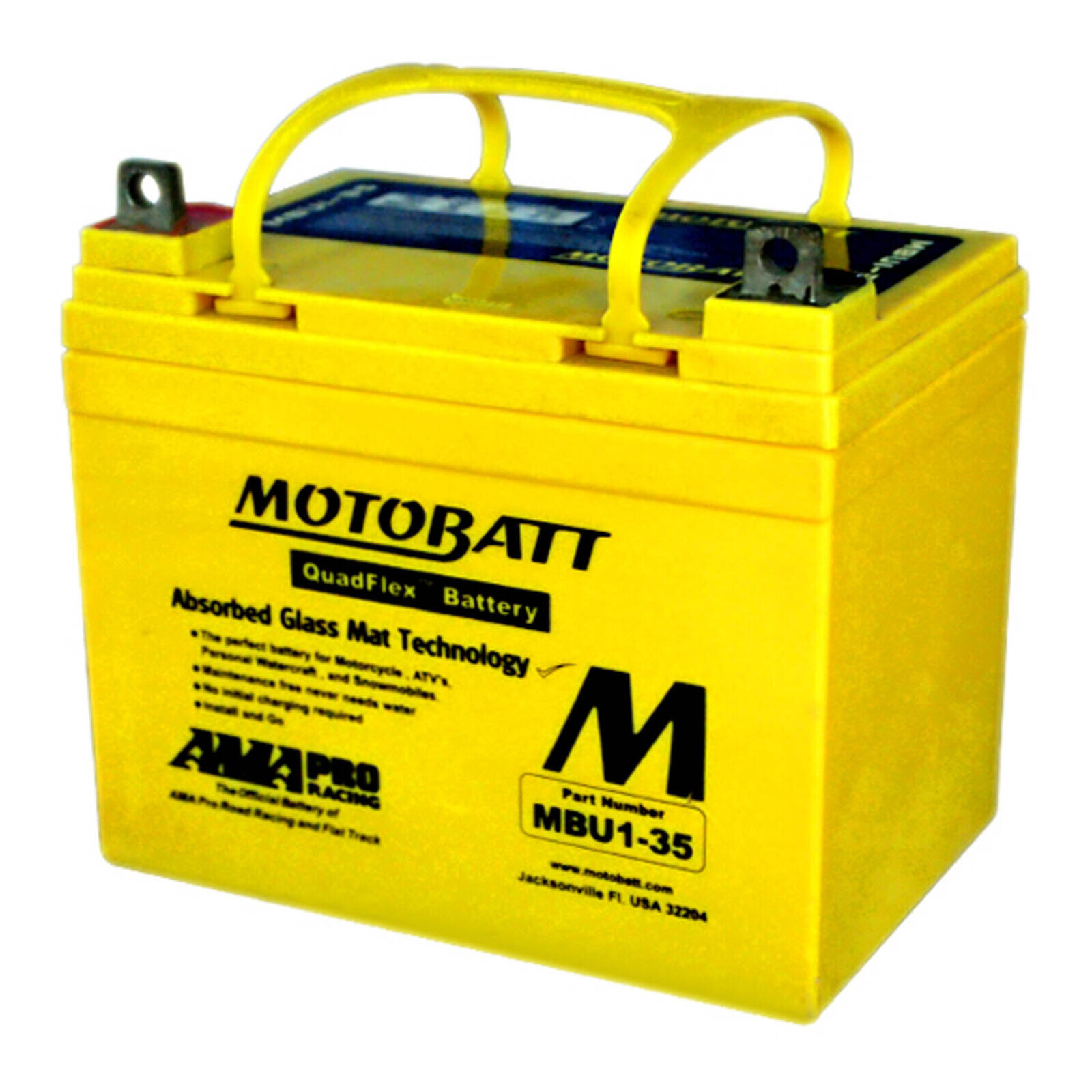 Motobatt batteries are manufactured from Absorbed Glass Mat (AGM) this design has revolutionised the motorcycle ATV lawnmower and small engine industry. QuadFlex provides a unique four-terminal design with two positives two negatives along with height spacers that permit an almost universal fit. All Motobatt AGM Batteries are maintenance free non-hazardous non-spill charged and ready to install directly out of the box.
