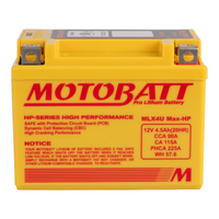 Motobatt Pro Lithium batteries are around 3x lighter than conventional lead- acid batteries yet they produce even greater cranking performance ideal in competitive environments. This additional power translates into the ability to provide strong starting currents that are required for reliable repeated starts at a wider range of temperatures than lead-acid batteries. Due to their very low idle discharge Motobatt Pro Lithium batteries can retain charge after more than a year of inactivity. Pro Lithium batteries have a high life expectancy with over 2000 cycles compared to around 500 for a lead-acid battery while also boasting a short recharge time supplying up to 90% charge after.