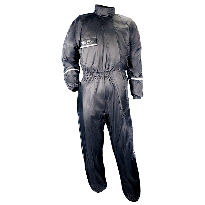 (RAINWEAR) \n \nA full 1 piece rainsuit constructed from hard wearing Nylon with PVC backing, all seams are carefully stitched and tape sealed to ensure a 100% waterproof seal. \nOther features include offset entry zip for easy entry, large zip closure leg cuffs to easily fit over boots. \nColour : Black with Night safety reflective stripes.