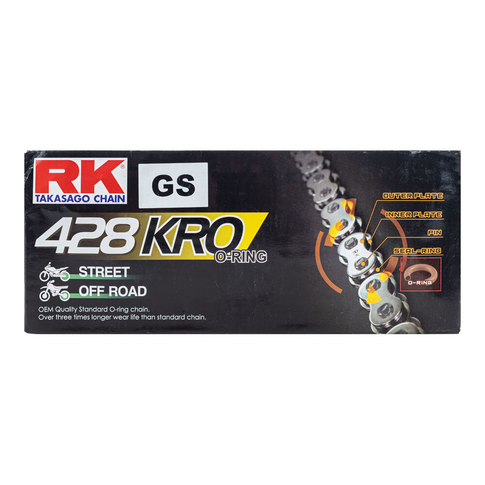 • RK sealed O-Ring chain features heat treated hi-carbon alloy steel components with seamless rollers and shouldered busings.