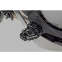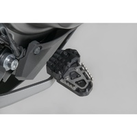 SW-MOTECH manufactures these extensions from high-strength milled aluminum alloy; they feature a black anodized surface and a stainless steel step plate. For optimal ergonomic adjustment, the increase in the brake pedal step can be adjusted in two stages of 22 or 27 millimeters.