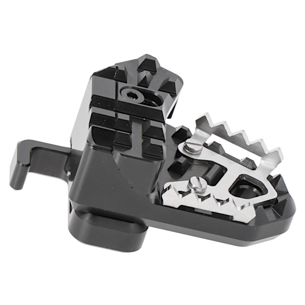SW-MOTECH manufactures these extensions from high-strength milled aluminum alloy; they feature a black anodized surface and a stainless steel step plate. For optimal ergonomic adjustment, the increase in the brake pedal step can be adjusted in two stages of 22 or 27 millimeters.