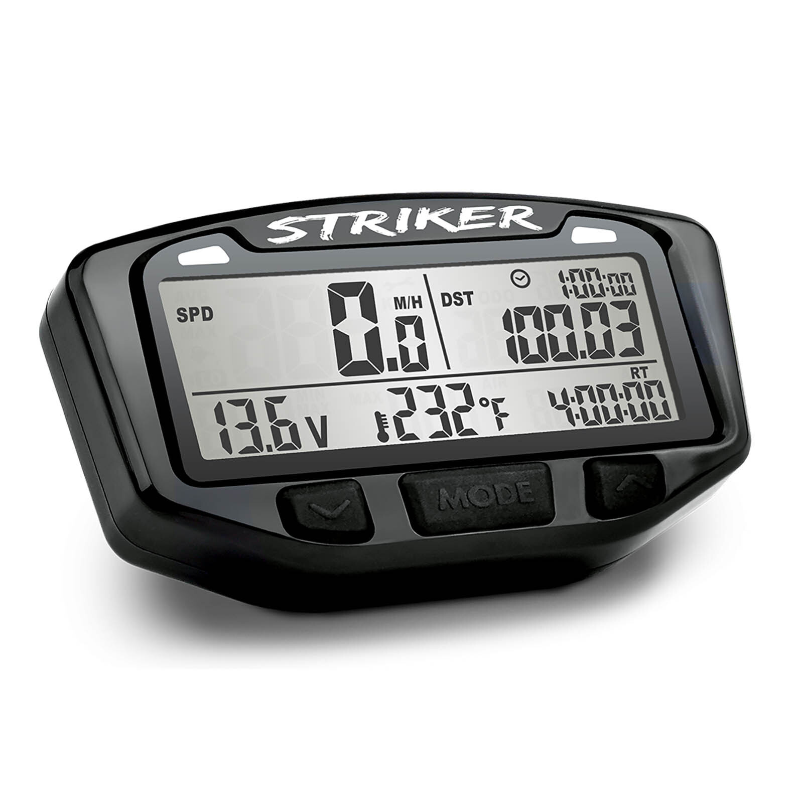 At only 4.2 x 2.3 inches Striker can replace a dashboard’s entireinstrument panel. Striker displays speed voltage trip distance clock andboth ambient and engine temperature. Striker also keeps track of theminimum and maximum voltage values (reset trip data to start fresh maxvalues.) Use the built-in stop watch for time trials. Two separatemaintenance timers OIL and WRENCH keep track in miles-since-last-reset.