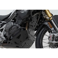 The engine guard extension protects the front area of the engine block from rock chips. This brushed and powder-coated aluminum protector can only be installed together with the SW-MOTECH engine guard.