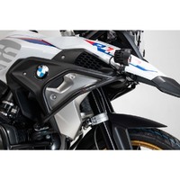 The upper crash bars are constructed of black, powder-coated steel and are mounted as a supplement to the crash bar by SW-MOTECH.
